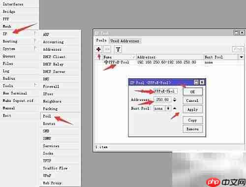 7、 在Address字段中输入分配的IP地址范围:192.168.250.60-192.168.250.80,确保覆盖所有需要使用的地址,以便后续PPPoE客户端获取有效IP。