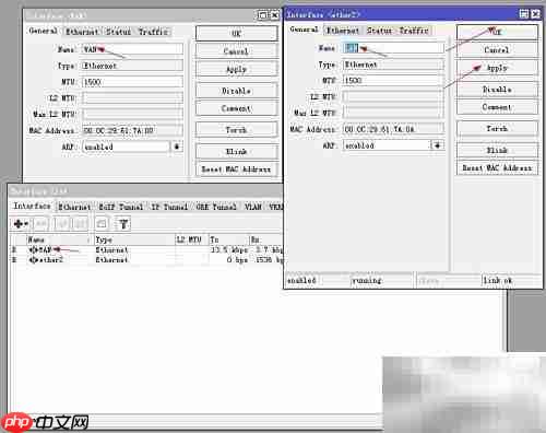 4、 进入接口(Interfaces)配置页面,将ether1接口设置为WAN口,ether2设置为LAN口,并依次点击Apply和OK保存设置。此操作可对两个端口进行重命名,便于后期维护与识别,提升整体网络结构的清晰度。