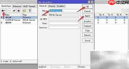 10、 在Interface菜单中创建一个新的PPPoE Server接口,命名为PPPoE-Server,点击Apply和OK完成接口创建。