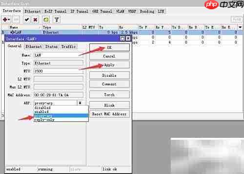 9、 返回接口设置页面,将LAN接口的ARP模式修改为proxy-arp(代理ARP),设置完成后点击应用并保存,以支持跨网段通信。
