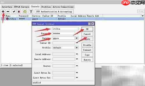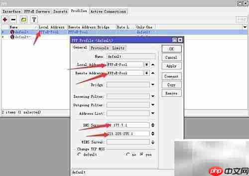 20、 Local Address选择之前创建的PPPoE-Pool,作为分配给客户端的网关地址来源。