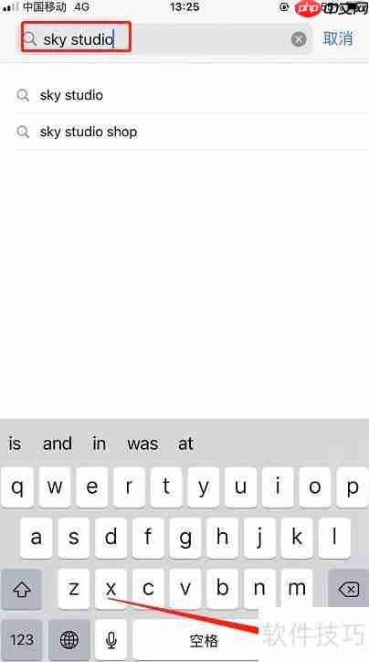 3、 在搜索栏中键入“sky studio”,随后点击键盘右下角的搜索图标开始查找。