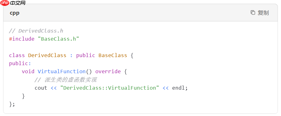 接着创建一个继承自基类的派生类,并在该类中提供与基类虚函数同名、同参数列表的函数实现,完成重写。例如: