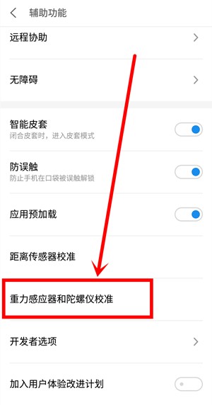 3.在辅助功能界面找到重力感应和陀螺仪校准选项,点击选项。