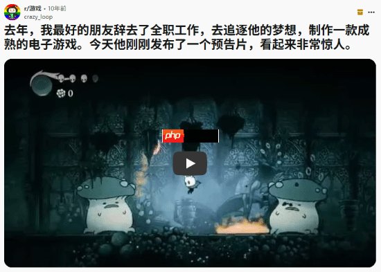 这篇帖子由用户crazy_loop在十年前发布,内容是2017年正式发售前的初代《空洞骑士》预告片,并附上了一段深情的文字:“去年,我最好的朋友辞去了全职工作,决心追逐梦想——制作一款完整的游戏。今天他发布的预告片,看起来简直令人震撼。”