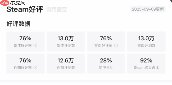 《空洞骑士:丝之歌》发售已满六天,截至目前,steam平台数据显示游戏评价数量突破13万条,但好评率持续走低,目前整体好评率为“76%”。这一数据相较于玩家此前对《丝之歌》的极高期待,显然略显逊色,尤其在对比前作《空洞骑士》长期保持“好评如潮”的情况下,更显得不尽如人意。