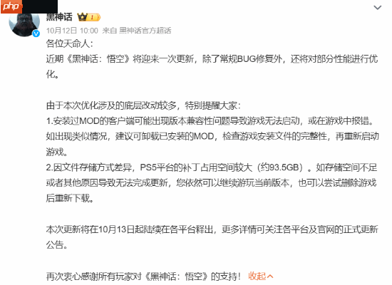 国产动作游戏《黑神话:悟空》官方发布公告,宣布自今日(10月13日)起,游戏将陆续在各大平台推送新版本更新。