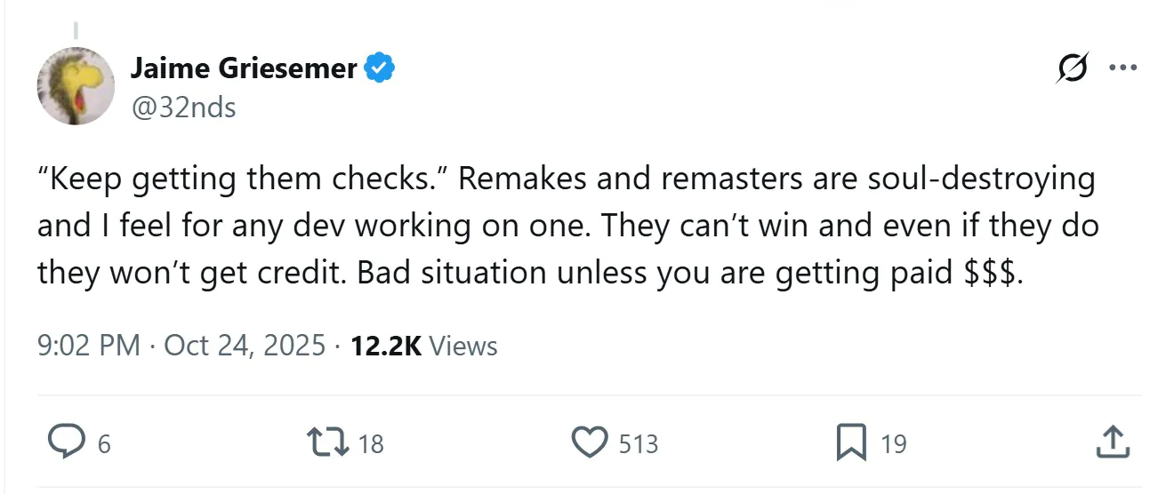 Griesemer在后续回复中进一步阐明立场,称此次重制缺乏原作的精神内核,认为“重制”这一理念本身便带有“扼杀灵魂”的倾向。他特别指出关卡设计存在严重缺陷,批评开发团队在视觉与玩法的结合上缺乏深度思考,暴露出战略层面的短视。